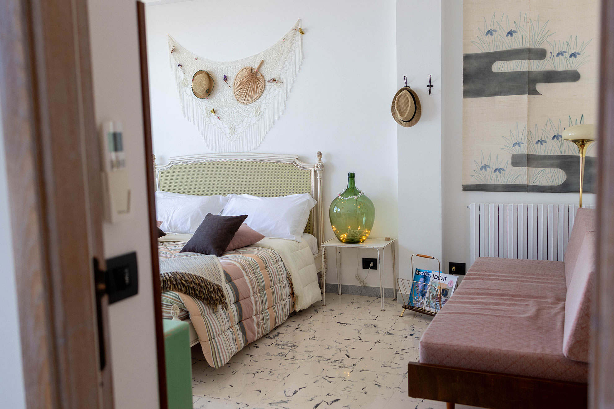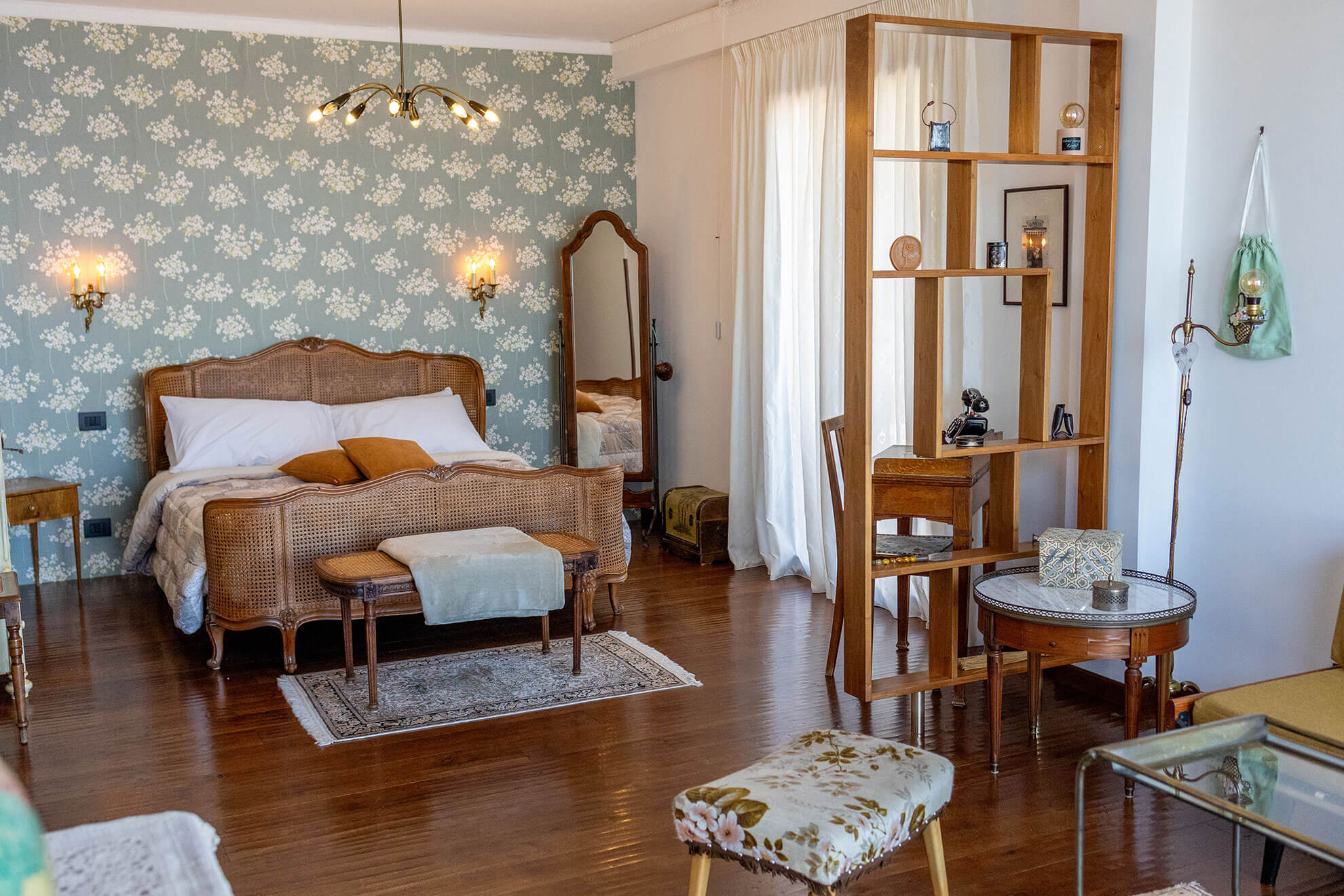 Private terrace. A room perfectly designed in every detail to recreate an evocative, retro ambience. Fromthe 70’s Danish furniture to the lively vintage pieces, including the floral cement flooring typical of old houses, everything blends delicately, enhancing the charm of yesteryear.